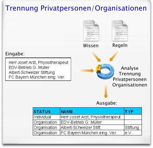 Da die AS ConvertBox nicht nur das Wissen über Privatpersonen hat, sondern zudem noch Firmeneigennamen und organisationsidentifizierende Worte kennt, lässt sich auf einfache Weise eine Trennung von Datensätzen mit Organisationsnamen und Datensätzen mit Privatpersonennamen durchführen.