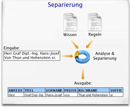 Die Separierungsfunktion der AS ConvertBox ermöglicht das automatische Verteilen der einzelnen Bestandteile eines eingegebenen Namens in die dafür vorgesehenen Felder.