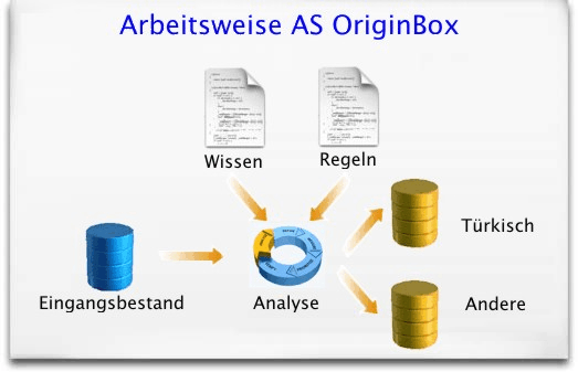 Die Arbeitsweise der AS OriginBox unterscheidet sich von anderen Verfahren, mit denen der sprachliche und kulturelle Hintergrund einer Person auf Basis des Namens identifiziert wird, im wesentlichen dadurch, dass der Vor- und Nachname und evtl. weitere Namenselemente zunächst analysiert, strukturiert und anschließend separat bestimmten Sprach- und/oder Kulturkreisen zugeordnet werden, um schließlich als Kombination aller Einzelinformationen ein Gesamtergebnis für die mögliche Zugehörigkeit zu generieren.