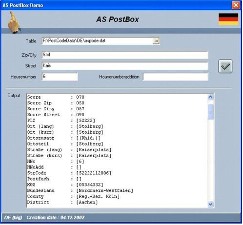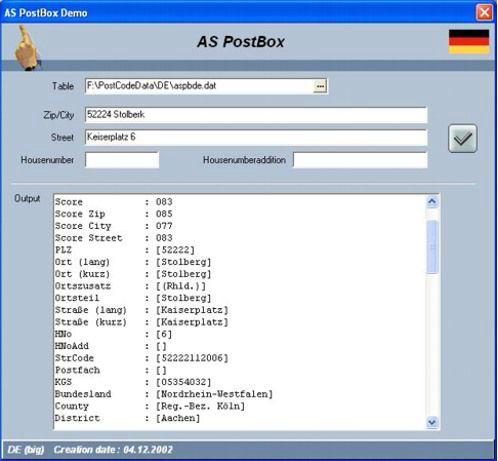 Bei der automatischen Adressprüfung und -korrektur versucht die AS PostBox durch intelligente Vergleiche das Ergebnis zu finden, welches mit der eingegebenen Adresse die höchste Übereinstimmung hat. Es werden zu jedem ausgegebenem Datensatz die Grade der Gesamtübereinstimmung, sowie die Teilergebnisse zurückgeliefert. Anhand dieser Ergebnisse kann auch während eines Batchlaufes eine optimale Selektion der korrigierbaren und der nicht korrigierbaren Datensätze getroffen werden. Zusätzlich werden zu einem Eingabedatensatz alle Informationen zurückgeliefert, die im Basisbestand vorhanden sind. Somit ist eine einfache Anreicherung der eigenen Daten mit z.B. Kreisgemeindeschlüssel oder Teilortinformationen gewährleistet.